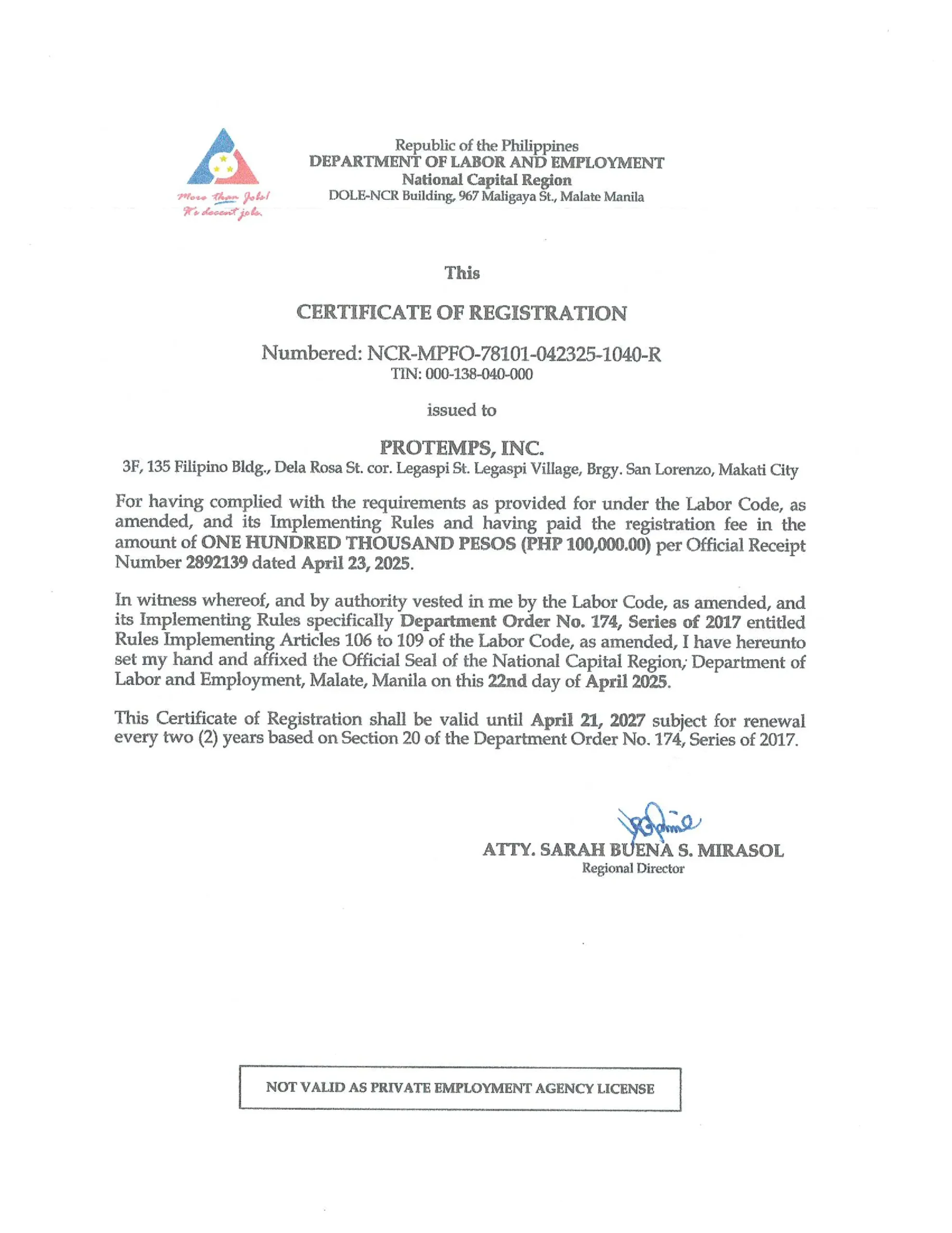 Protemps partners with businesses to provide them with proficient and professional workers in a timely manner. We partner with Filipino workers to place them in a productive and rewarding industry that allows personal and professional growth. We champion fair and responsible employment within the Philippine context and inspired by global standards.